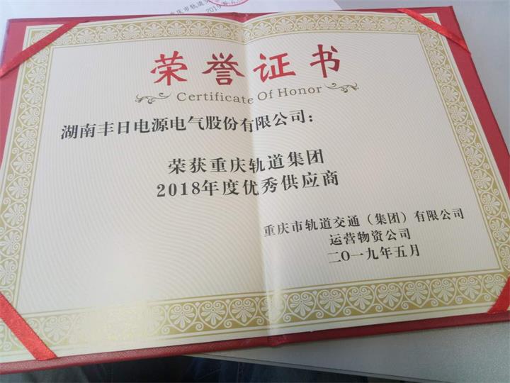 2019年5月,湖南丰日电源电气股份有限公司荣获重庆轨道集团2018年度优秀供应商。